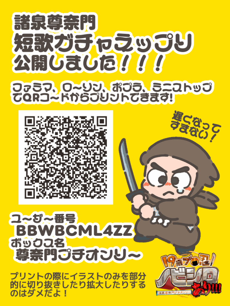 5/3のイベント当日、尊奈門プチオンリー本部スペースにて、ガチャでだした短歌をイラスト付き短歌カードにしてプレゼントします♪